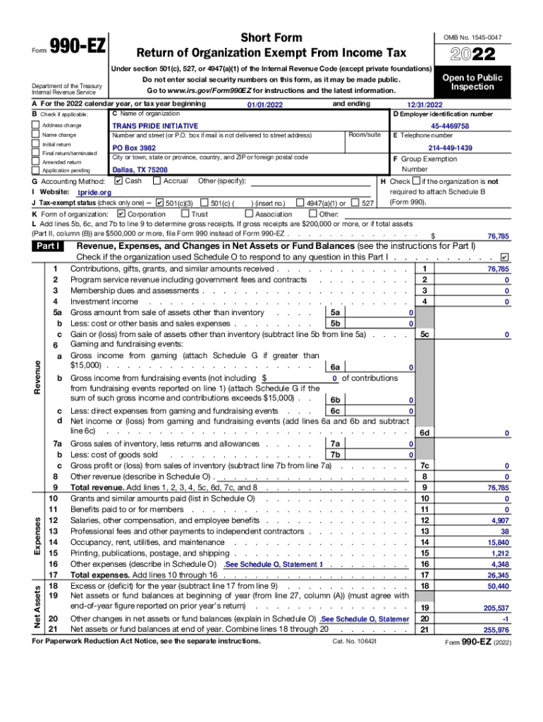 Form Short Form Return of Organization Exempt From Income Tax990EZDepartment of the Treasury Internal Revenue ServiceUnder section 501(c), 527, or 4947(a)(1) of the Internal Revenue Code (except private