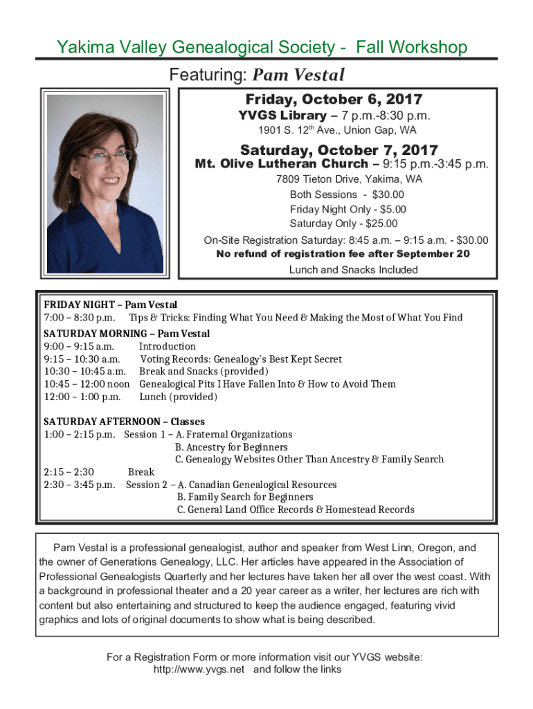 Yakima Valley Genealogical Society Fall Workshop Featuring: Pam Vestal Friday, October 6, 2017YVGS Library 7 p.m.8:30 p.m. 1901 S. 12th Ave., Union Gap, WA Saturday, October 7, 2017 Mt. Olive Lutheran