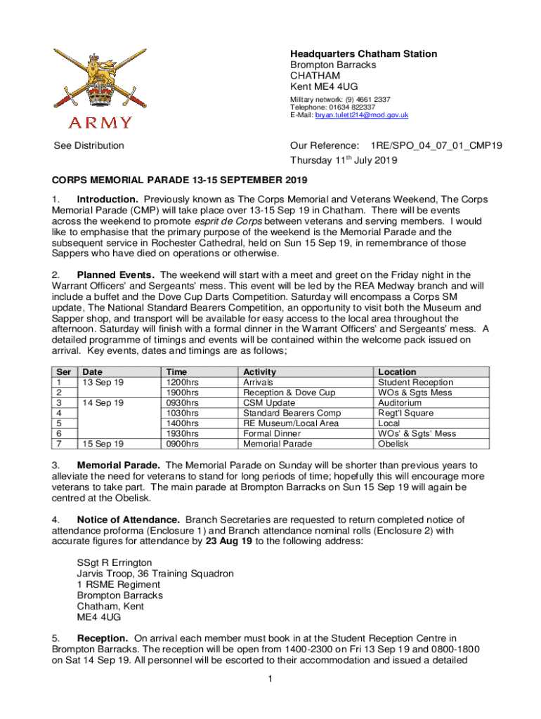 Headquarters Chatham Station Brampton Barracks CHATHAM Kent ME4 4UG Military network: (9) 4661 2337 Telephone: 01634 822337 Email: bryan.tulett214@mod.gov.ukSee Distribution Reference:1RE/SO_04_07_01_CMP19thThursday