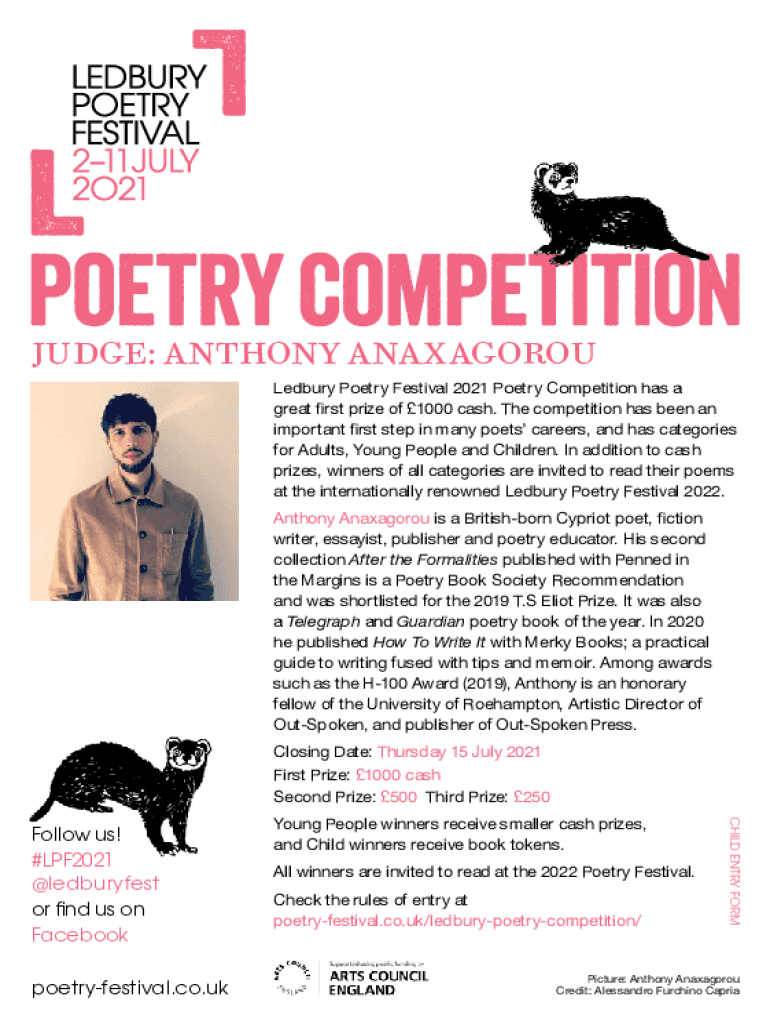 Judge: Anthony Anaxagoras Led bury Poetry Festival 2021 Poetry Competition has a great first prize of 1000 cash. The competition has been an important first step in many poets careers, and has categories
