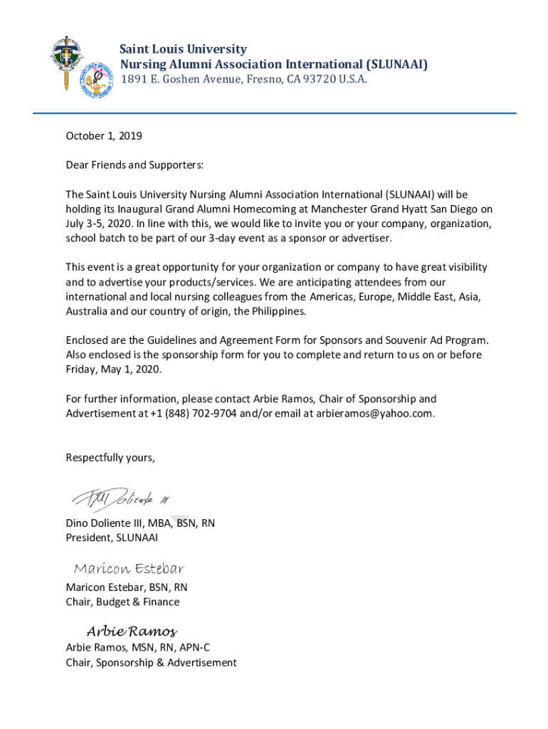 Saint Louis University Nursing Alumni Association International (SUNDAY) 1891 E. Goshen Avenue, Fresno, CA 93720 U.S.A. October 1, 2019, Dear Friends and Supporters: The Saint Louis University Nursing