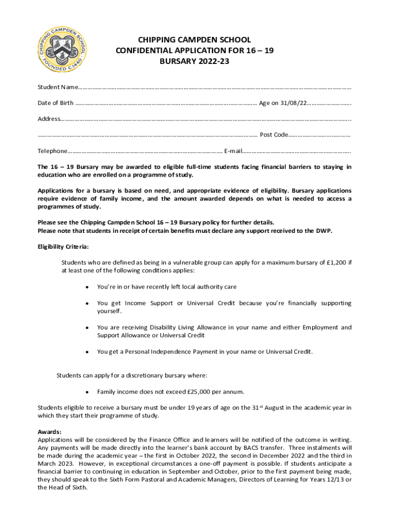 CHIPPING CAMDEN SCHOOL CONFIDENTIAL APPLICATION FOR 16 19 BURSARY 202223 Student Name Date of Birth Age on 31/08/22. Address