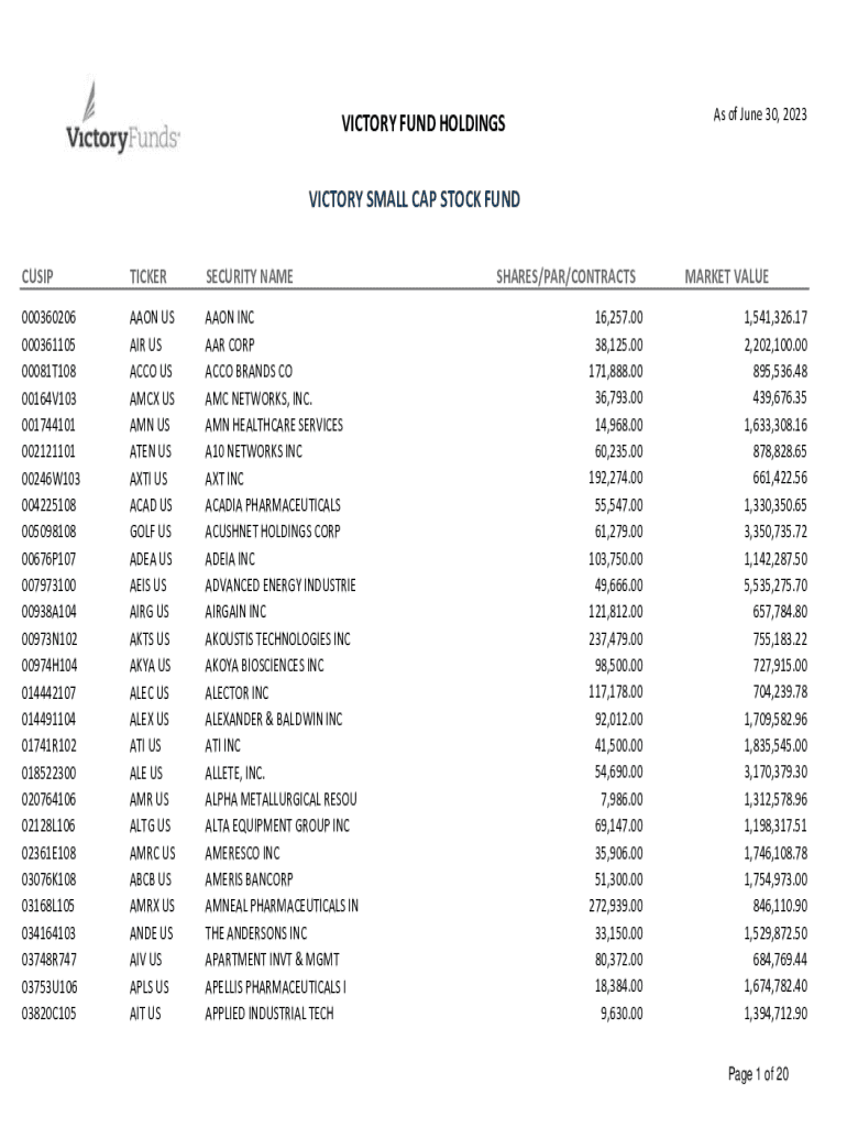 As of June 30, 2023VICTORY FUND HOLDINGS VICTORY SMALL CAP STOCK FUND CUSIPTICKERSECURITY NAME000360206 000361105 00081T108 00164V103 001744101 002121101 00246W103 004225108 005098108 00676P107 007973100