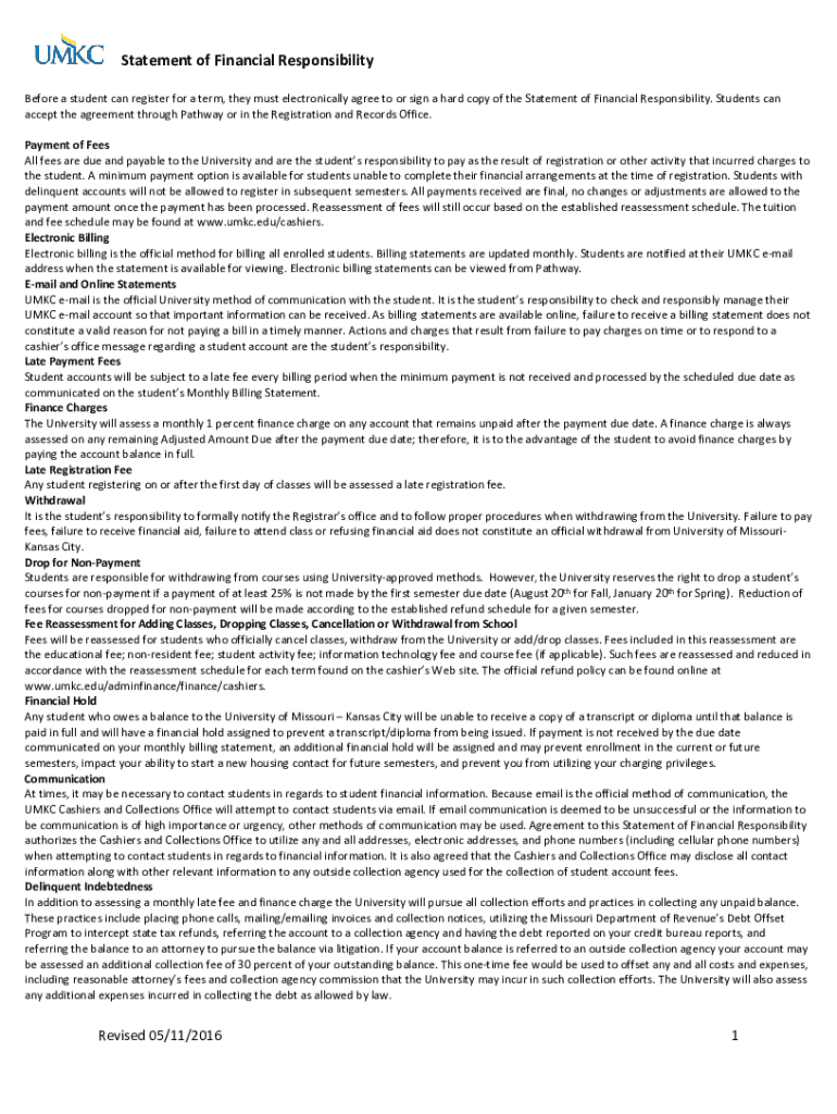 Statement of Financial Responsibility Before a student can register for a term, they must electronically agree to or sign a hard copy of the Statement of Financial Responsibility. Students can accept
