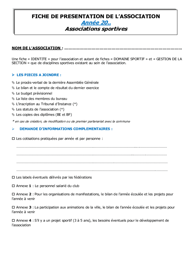 FICHE DE PRESENTATION DE LASSOCIATIONAnne 20. Associations sportivesNOM DEL ASSOCIATION : One fiche IDENTITY pour association ET mutant DE fiches DOMAIN SPORT IF ET SECTION DE LA SECTION Que de disciplines