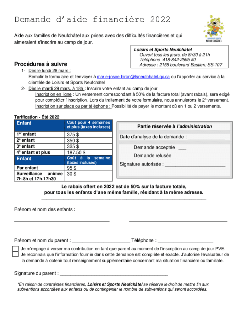 Demanded aide financier 2022 Aide aux families de Neuchatel aux prices Alec DES difficult financier set quit aimeraient s\'inscribe AU camp DE four. Procedures suivreLoisirs et Sports Neuchatel Overt