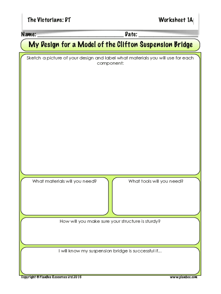 The Victorians: Worksheet 1AName: ___ Date: ___My Design for a Model of the Clifton Suspension Bridge Sketch a picture of your design and label what materials you will use for each component:What