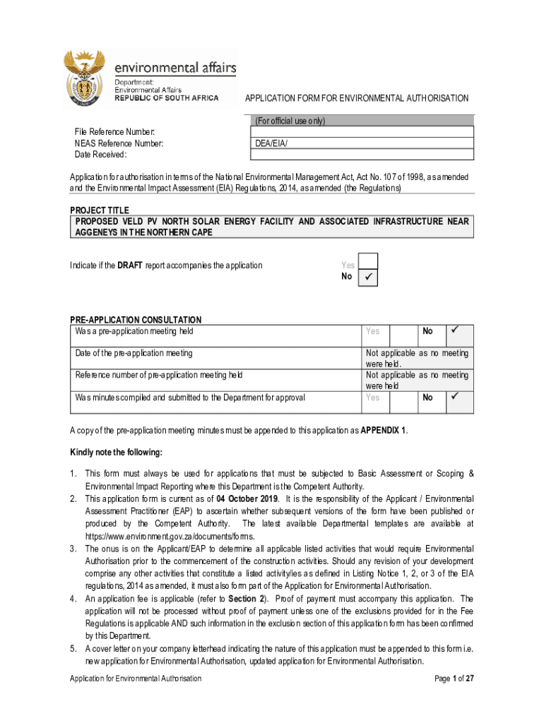 APPLICATION FORM FOR ENVIRONMENTAL Authorization (For official use only) File Reference Number: NEAR Reference Number: Date Received:DEA/EIA/Application for authorization in terms of the National