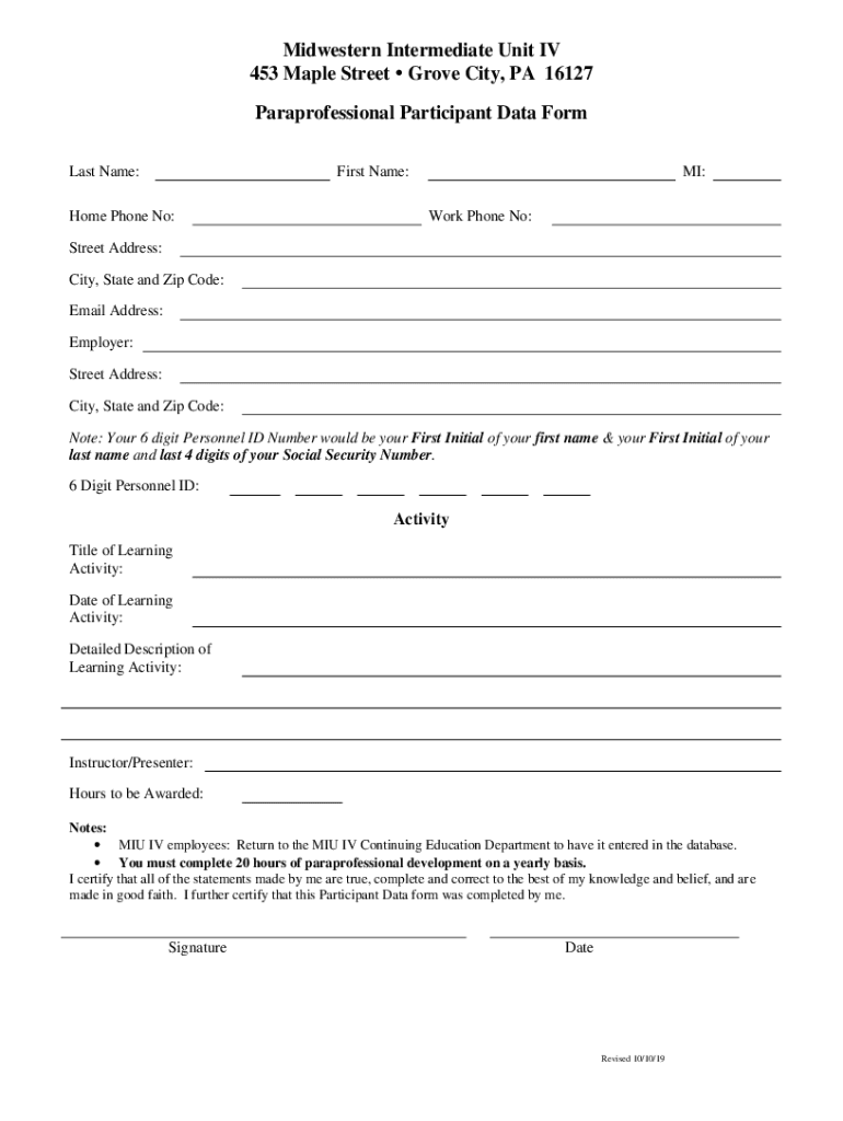 Midwestern Intermediate Unit IV 453 Maple Street Grove City, PA 16127 Paraprofessional Participant Data Form Last Name:First Name:Home Phone No:MI: Work Phone No:Street Address: City, State and Zip