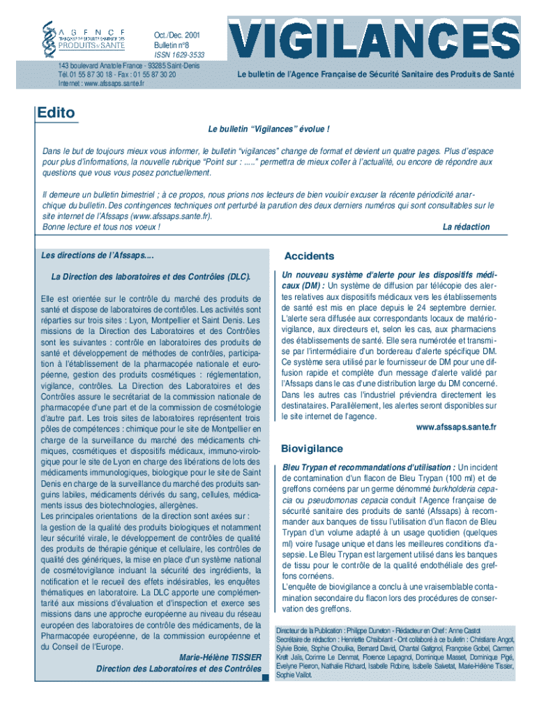 Oct./Dec. 2001 Bulletin n8 ISSN 16293533 143 boulevard Anatole France 93285 SaintDenis Tl.01 55 87 30 18 Fax : 01 55 87 30 20 Internet : www.afssaps.sante.frLe bulletin de lAgence Franaise de Scurit