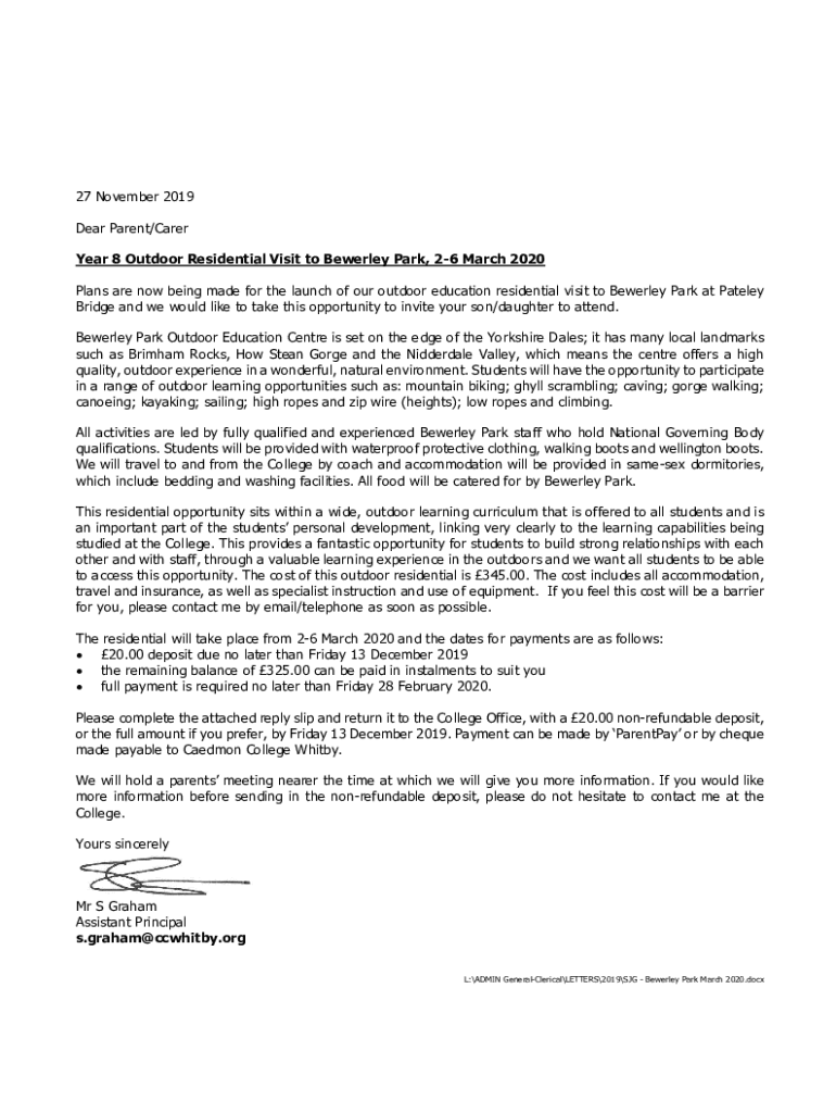 27 November 2019 Dear Parent/Carer Year 8 Outdoor Residential Visit to Beverley Park, 26 March 2020 Plans are now being made for the launch of our outdoor education residential visit to Beverley Park
