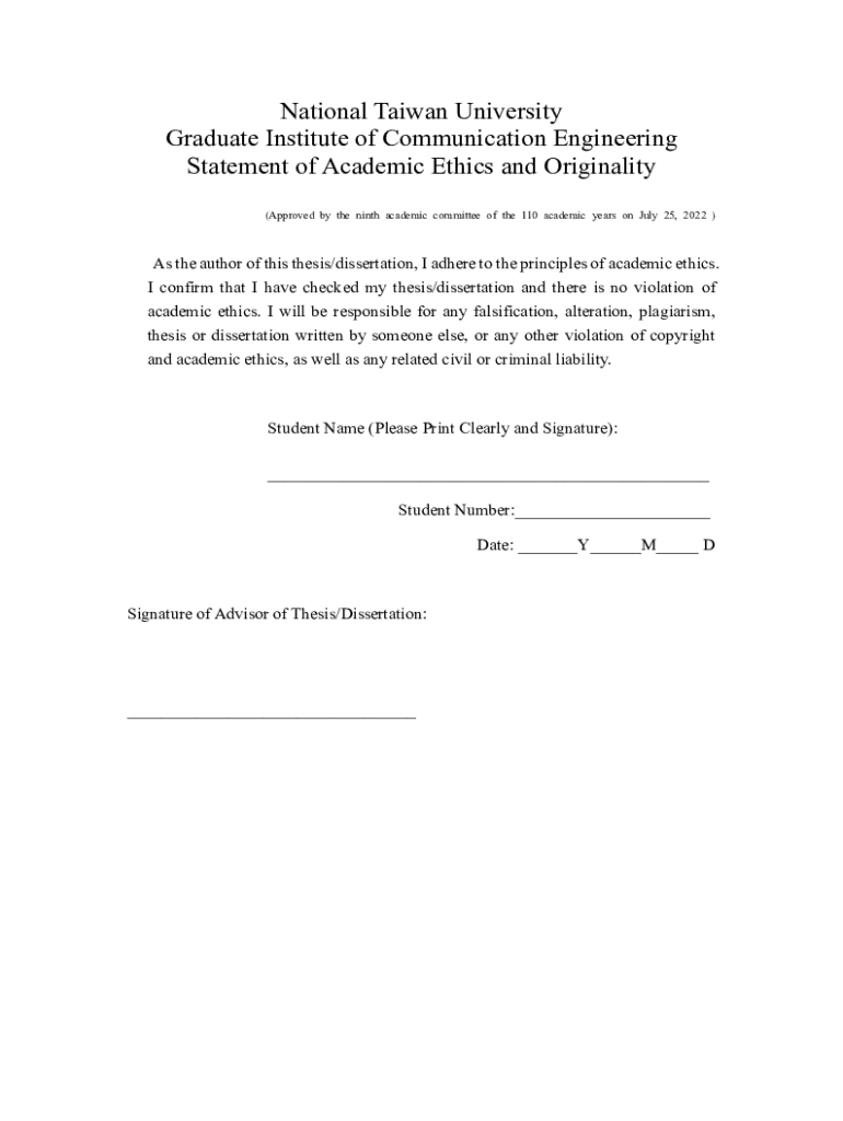 National Taiwan University Graduate Institute of Communication Engineering Statement of Academic Ethics and Originality (Approved by the ninth academic committee of the 110 academic years on July