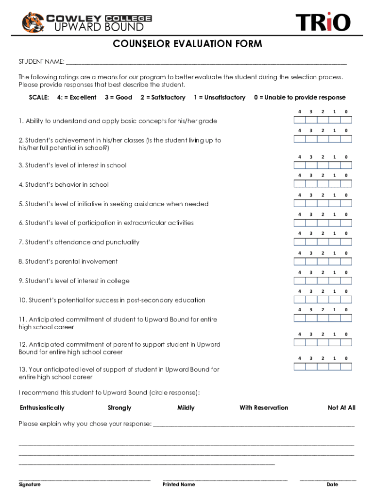 UPWARD BOUND COUNSELOR EVALUATION FORM STUDENT NAME: ___ The following ratings are a means for our program to better evaluate the student during the selection process. Please provide responses that