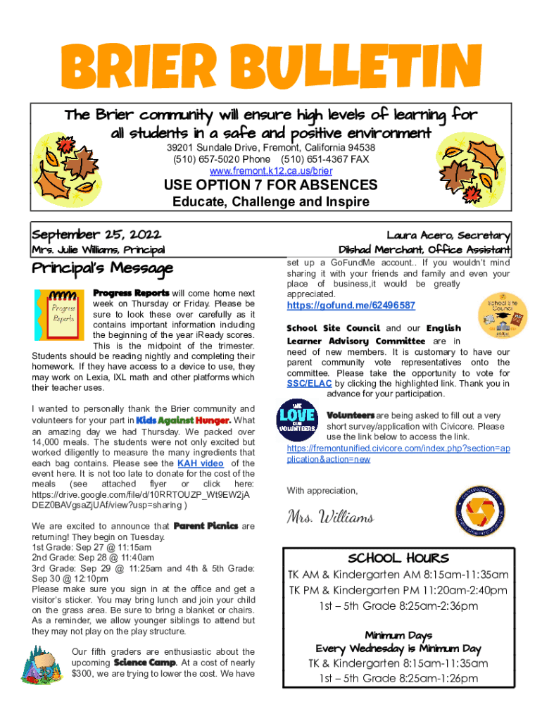 BRIER BULLETIN The Brier community will ensure high levels of learning for all students in a safe and positive environment 39201 Sundae Drive, Fremont, California 94538 (510) 6575020 Phone (510) 6514367