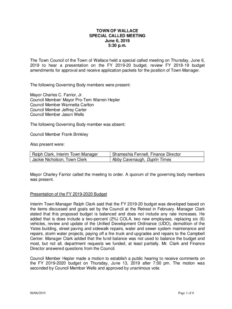TOWN OF WALLACE SPECIAL CALLED MEETING June 6, 2019 5:30 p.m. The Town Council of the Town of Wallace held a special called meeting on Thursday, June 6, 2019, to hear a presentation on the FY 201920