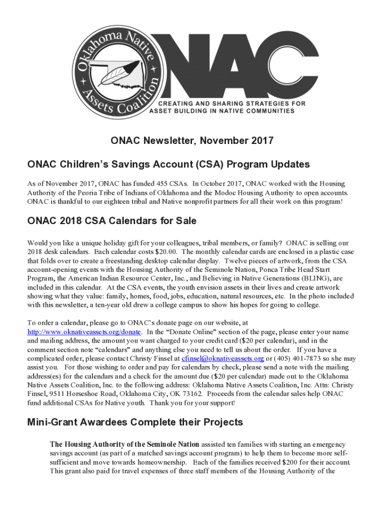 NAC Newsletter, November 2017ONAC Children's Savings Account (CSA) Program Updates As of November 2017, NAC has funded 455 CSA's. In October 2017, NAC worked with the Housing Authority of the Peoria