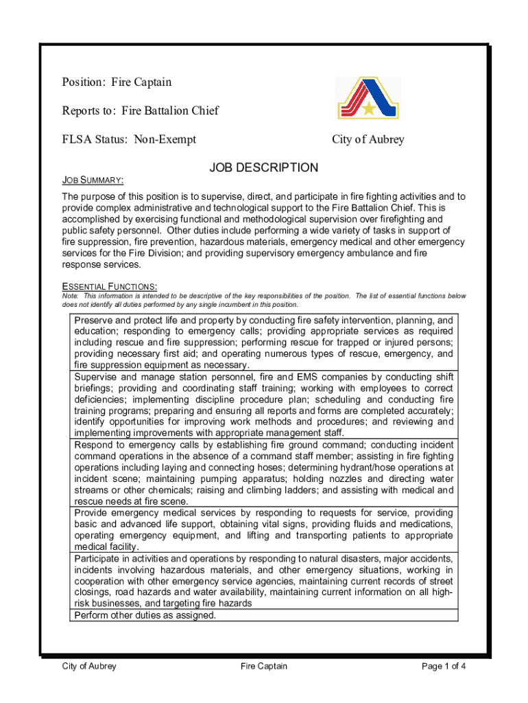 Position: Fire Captain Reports to: Fire Battalion Chief FLEA Status: Nonexempt JOB SUMMARY:City of Aubrey JOB Description purpose of this position is to supervise, direct, and participate in fire