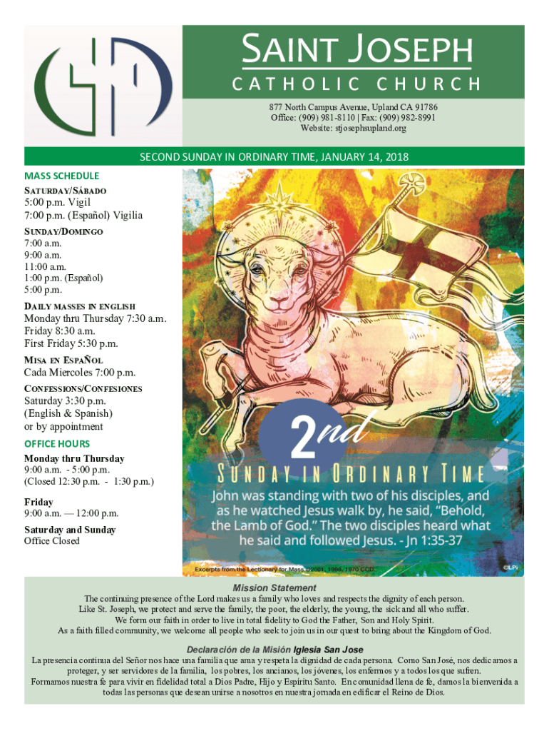Website: stjosephsupland. Second SUNDAY IN ORDINARY TIME, JANUARY 14, 2018,