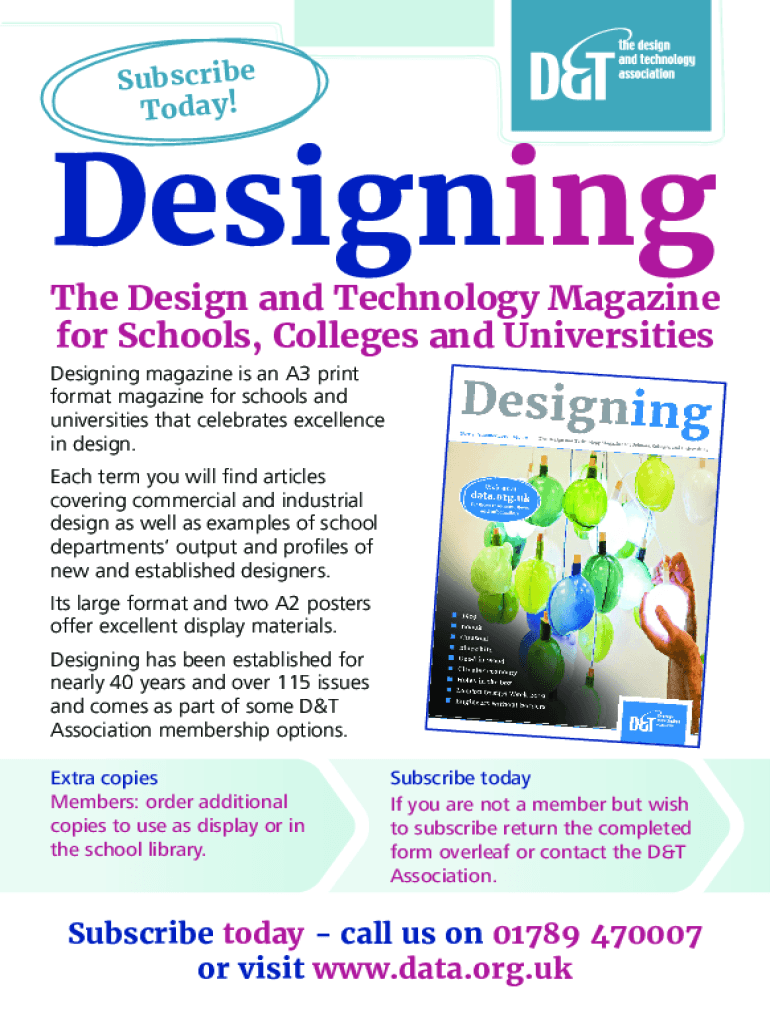 Subscribe Today! Designing Design and Technology Magazine for Schools, Colleges and Universities Designing magazine is an A3 print format magazine for schools and universities that celebrates excellence