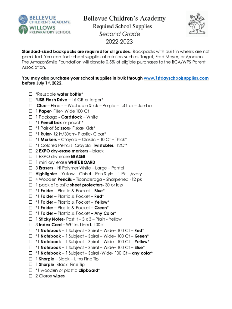 Bellevue Children's Academy Required School Supplies Second Grade 20222023 Standardized backpacks are required for all grades. Backpacks with built-in wheels are not permitted. You can find school