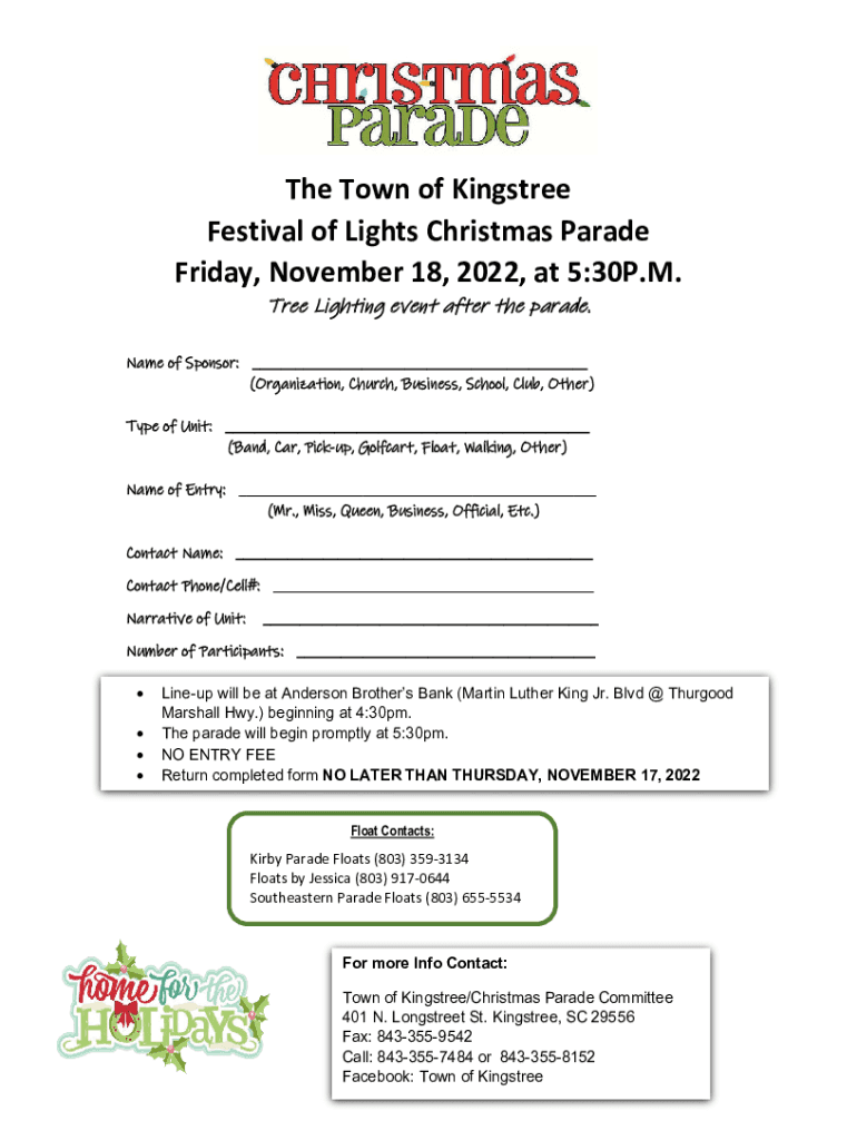 The Town of Kings tree Festival of Lights Christmas Parade Friday, November 18, 2022, at 5:30P. M. Tree Lighting event after the parade. Name of Sponsor: ___ (Organization, Church, Business, School,