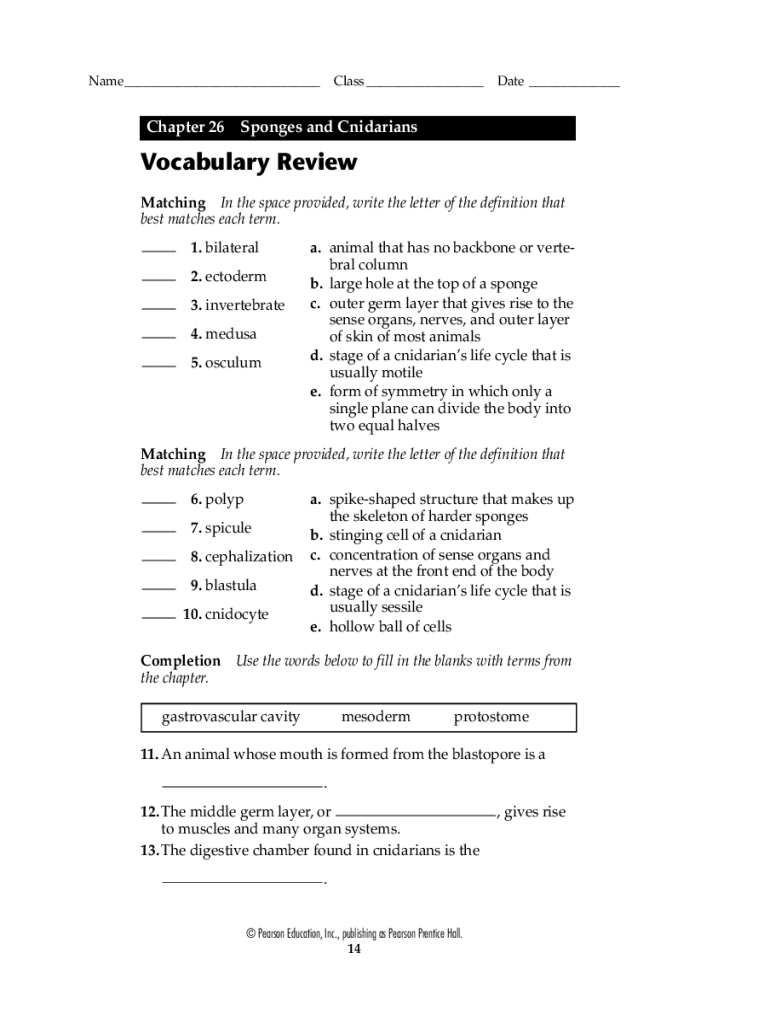 Bio07_TR__U08_CH26.QXD5/4/064:17 PM Page 14Name___Chapter 26Class ___Date ___Sponges and CnidariansVocabulary Review Matching In the space provided, write the letter of the definition that best matches