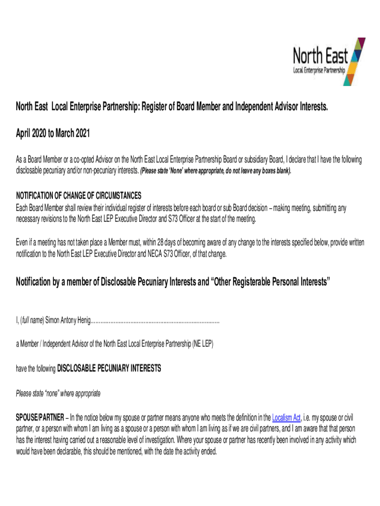 North East Local Enterprise Partnership: Register of Board Member and Independent Advisor Interests. April 2020 to March 2021 As a Board Member or a cooped Advisor on the North East Local Enterprise