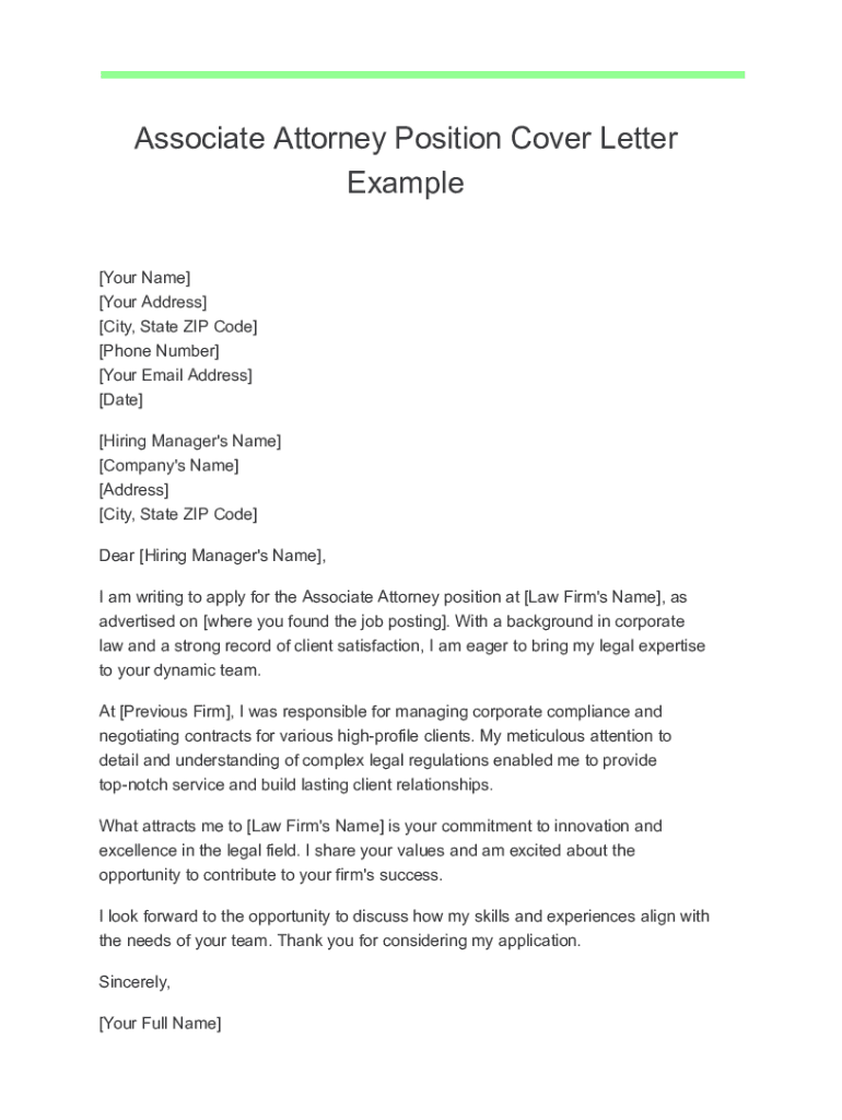 Associate Attorney Position Cover Letter Example [Your Name] [Your Address] [City, State ZIP Code] [Phone Number] [Your Email Address] [Date] [Hiring Manager\'s Name] [Company\'s Name] [Address] [City,