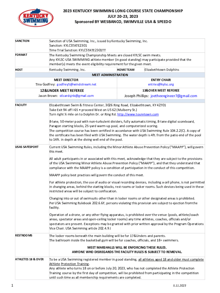 2023 KENTUCKY SWIMMING LONG COURSE STATE CHAMPIONSHIP JULY 2023, 2023 Sponsored BY WETBACK, SEVILLE USA & SPEEDOSANCTIONFORMATHOSTSanction of USA Swimming, Inc., issued by Kentucky Swimming, Inc.