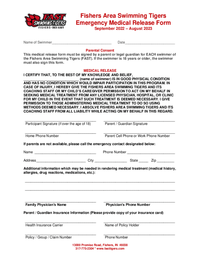 Fishers Area Swimming Tigers Emergency Medical Release Form September 2022 August 2023 Name of Swimmer ___Date___Parental Consent This medical release form must be signed by a parent or legal guardian