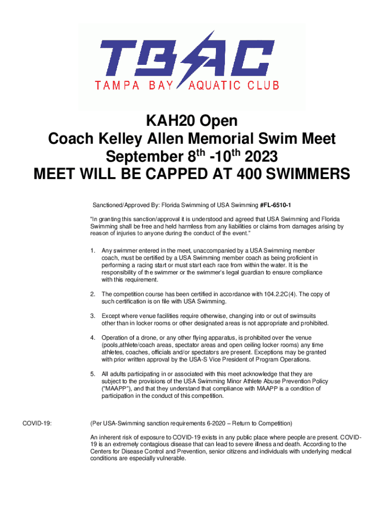 KAH20 Open Coach Kelley Allen Memorial Swim Meet September 8th 10th 2023 MEET WILL BE CAPPED AT 400 SWIMMERS Sanctioned/Approved By: Florida Swimming of USA Swimming #FL65101 In granting this sanction/approval