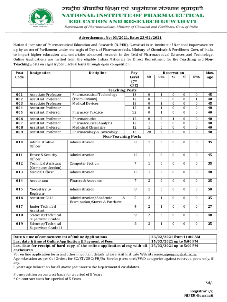 Advertisement No: 03/2021, Date: 23/02/2021 National Institute of Pharmaceutical Education and Research (SNIPER), Guwahati is an Institute of National Importance set up by an Act of Parliament under