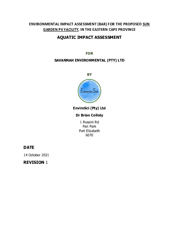 ENVIRONMENTAL IMPACT ASSESSMENT (BAR) FOR THE PROPOSED SUN GARDEN PV FACILITY, IN THE EASTERN CAPE PROVINCE AQUATIC IMPACT ASSESSMENT SAVANNAH ENVIRONMENTAL (PTY) LTDBYEnviroSci (Pty) Ltd Dr Brian