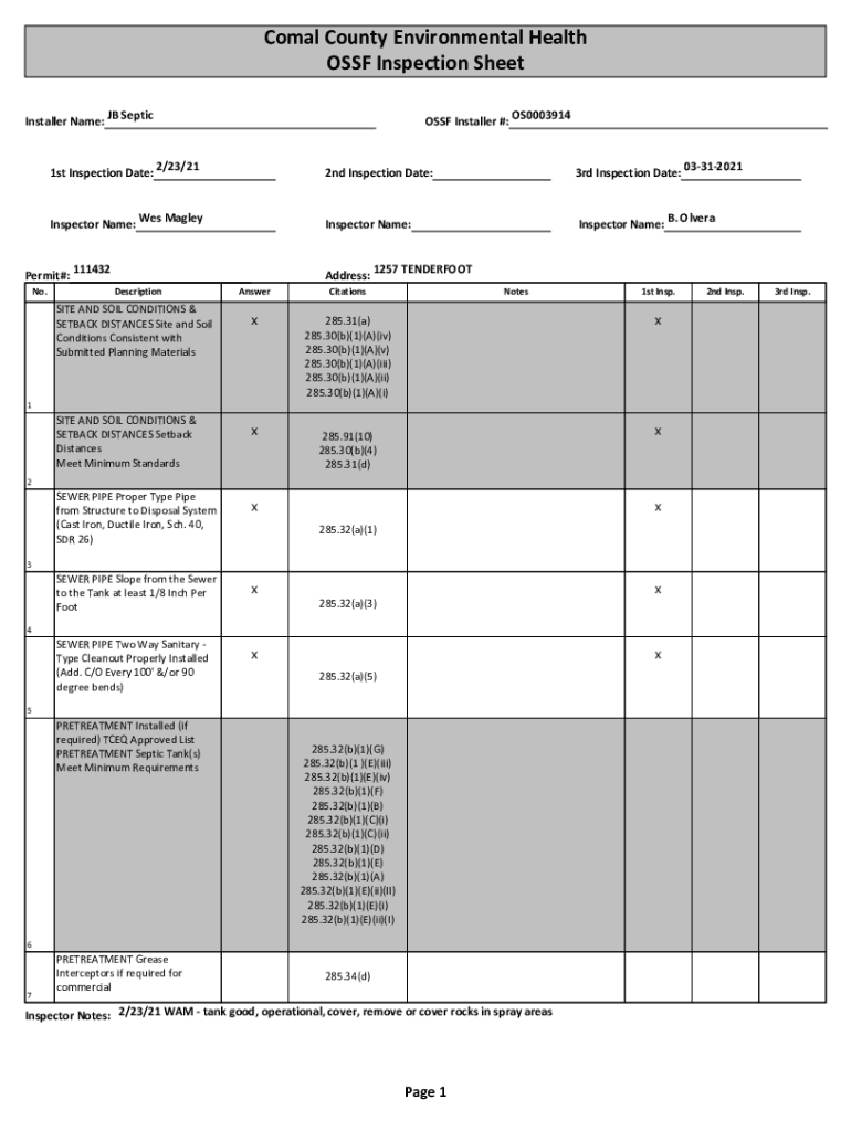 Coal County Environmental Health OSF Inspection Sheet Installer Name:OSF Installer #: OS0003914JB Septic1st Inspection Date: 2/23/212th Inspection Date:3rd Inspection Date: 03312021Inspector Name: