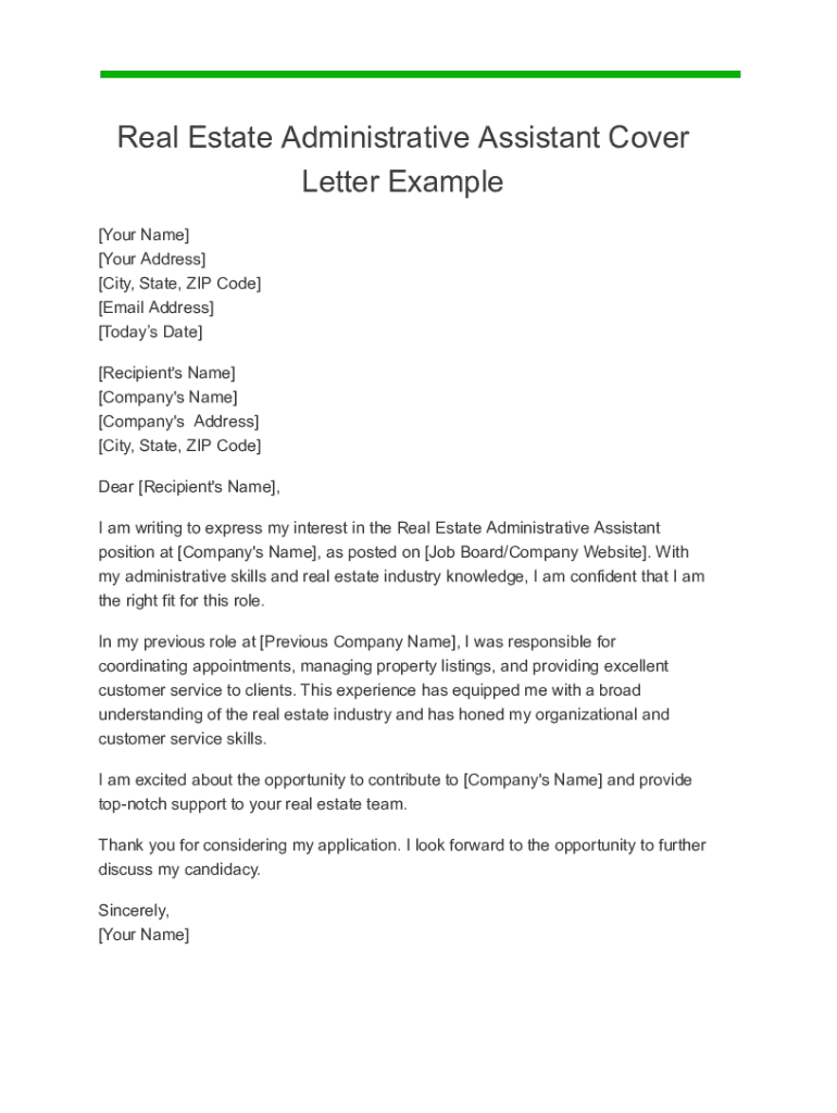 Real Estate Administrative Assistant Cover Letter Example [Your Name] [Your Address] [City, State, ZIP Code] [Email Address] [Today's Date] [Recipient\'s Name] [Company\'s Name] [Company\'s Address]