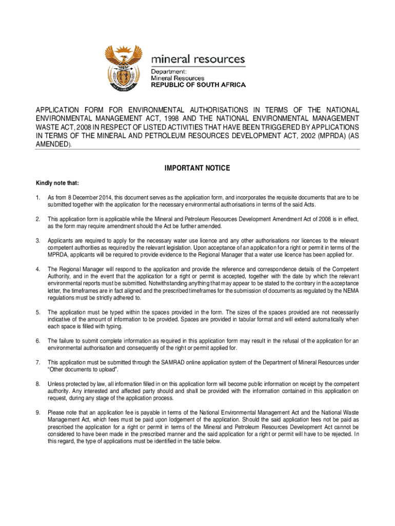 APPLICATION FORM FOR ENVIRONMENTAL Authorizations IN TERMS OF THE NATIONAL ENVIRONMENTAL MANAGEMENT ACT, 1998 AND THE NATIONAL ENVIRONMENTAL MANAGEMENT WASTE ACT, 2008 IN RESPECT OF LISTED ACTIVITIES
