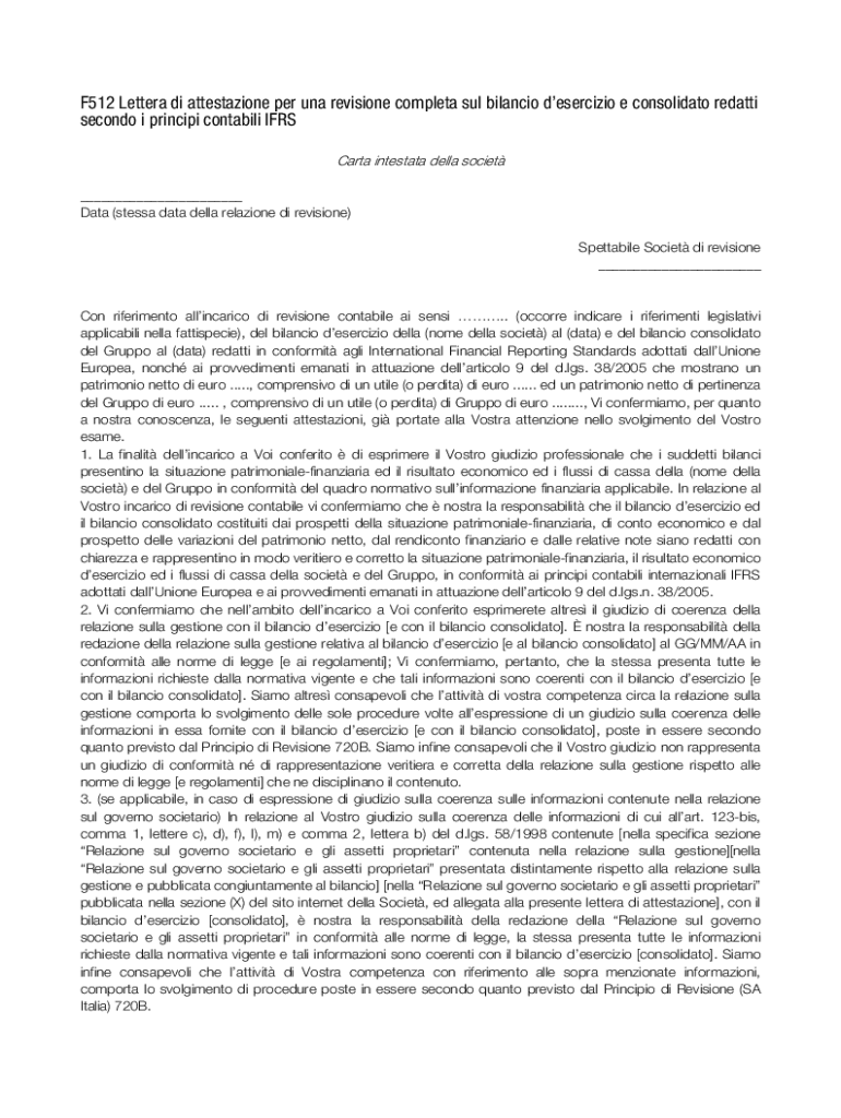 F512 Letter DI attestation per RNA revision complete sub Blanco desercizio e consolidate regatta second i Principe cantabile IFRS CARTA intestate Della society ___ Data (Tessa data Della relations