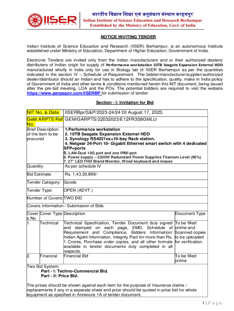 NOTICE INVITING TENDER Indian Institute of Science Education and Research (WISER) Berhampur, is an autonomous Institute established under Ministry of Education, Department of Higher Education, Government