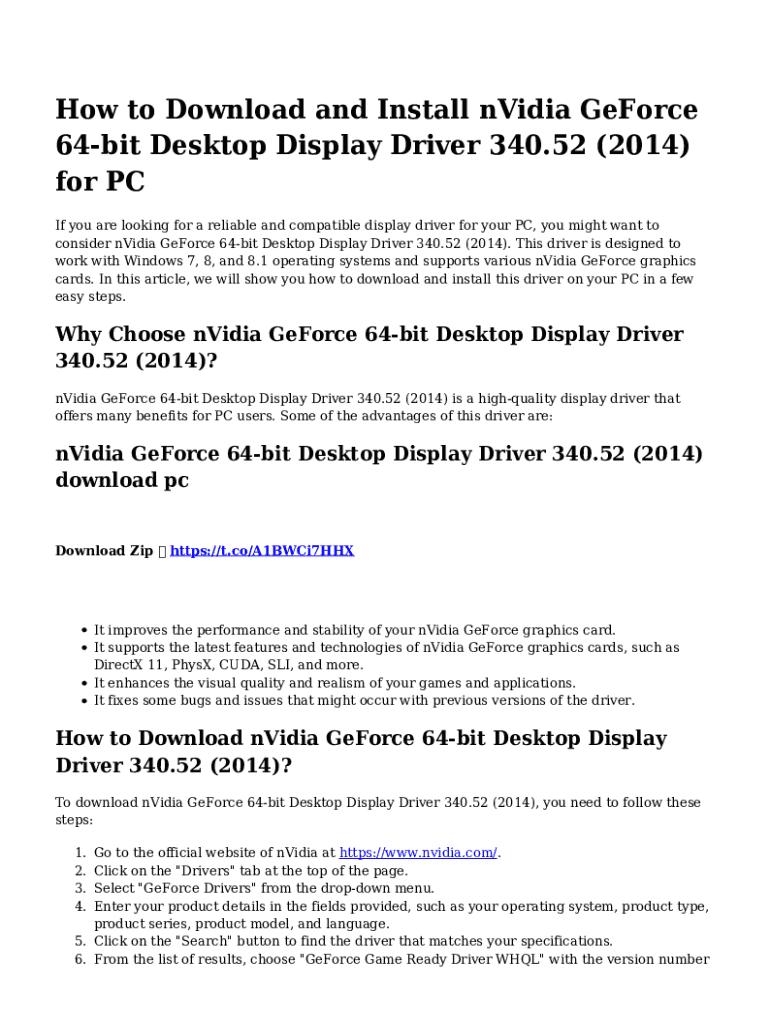 How to Download and Install NVIDIA GeForce 64bit Desktop Display Driver 340.52 (2014) for PC If you are looking for a reliable and compatible display driver for your PC, you might want to consider