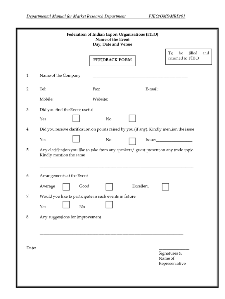 Departmental Manual for Market Research DepartmentFIEO/RMS/MID/01Federation of Indian Export Organizations (FIEF) Name of the Event Day, Date and Veneto be filled and returned to BIOFEEDBACK FORM