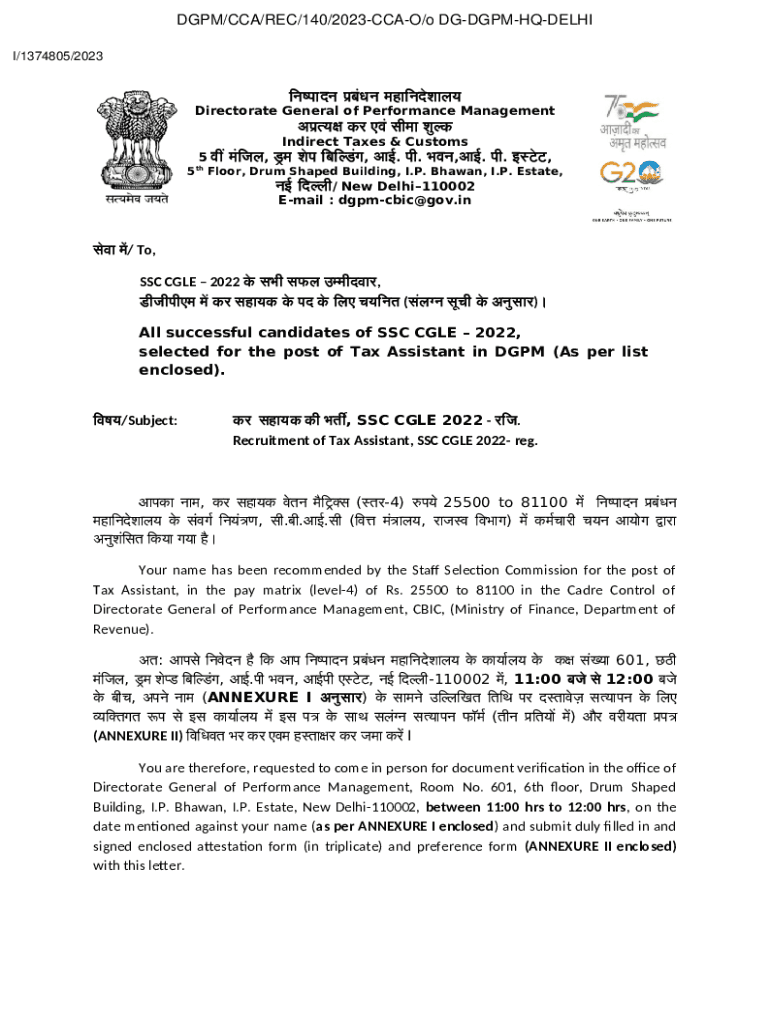GPM/CCA/REC/140/2023CCAO/o DGDGPMHQDELHI I/1374805/2023 Directorate General of Performance Management Indirect Taxes & Customs 5, , . . , , 5th Floor, Drum Shaped Building, I.P. Shawn, I.P. Estate,