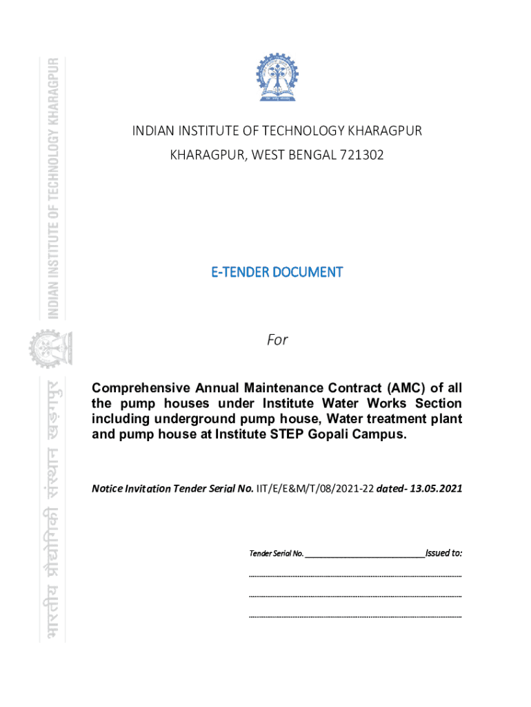 INDIANINSTITUTEOFTECHNOLOGYKHARAGPUR BHAGALPUR,WESTBENGAL721302 ETENDERDOCUMENT For Comprehensive Annual Maintenance Contract (AMC) of all the pump houses under Institute Water Works Section including