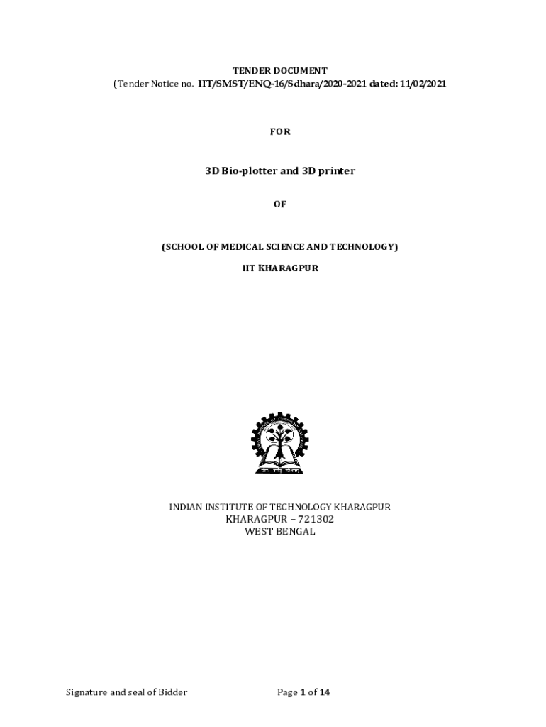 TENDER DOCUMENT (Tender Notice no. IIT/SMS/ENQ16/Sahara/20202021 dated: 11/02/2021FOR3D Bioplotter and 3D printer OF(SCHOOL OF MEDICAL SCIENCE AND TECHNOLOGY) IIT KHARAGPURINDIAN INSTITUTE OF TECHNOLOGY