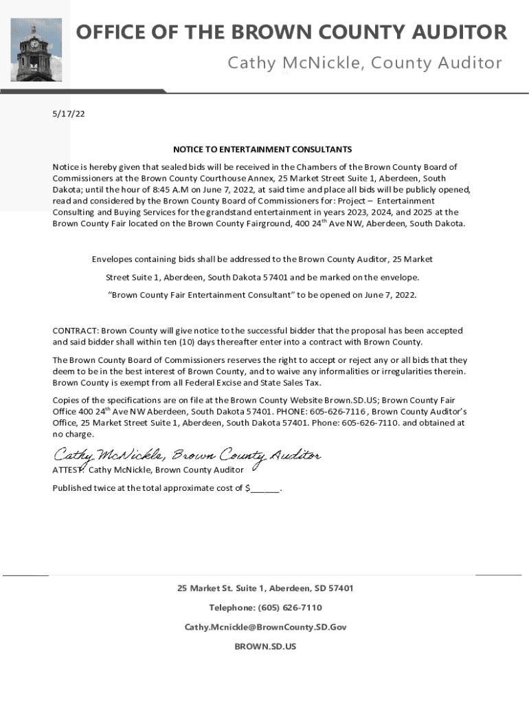 OFFICE OF THE BROWN COUNTY AUDITOR Cathy Nickle, County Auditor5/17/22NOTICE TO ENTERTAINMENT CONSULTANTS Notice is hereby given that sealed bids will be received in the Chambers of the Brown County