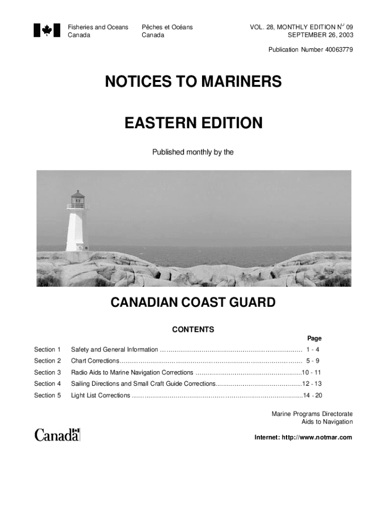 Fisheries and Oceans CanadaPches et Cans CanadaOVOL. 28, MONTHLY EDITION N 09 SEPTEMBER 26, 2003, Publication Number 40063779NOTICES TO MARINERS EASTERN EDITION Published monthly by Canadian COAST