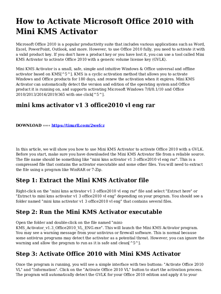 How to Activate Microsoft Office 2010 with Mini KMS Activator Microsoft Office 2010 is a popular productivity suite that includes various applications such as Word, Excel, PowerPoint, Outlook, and
