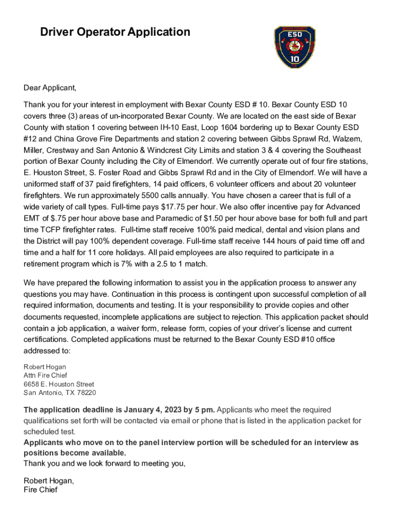 Driver Operator ApplicationDear Applicant, Thank you for your interest in employment with Bexar County ESD # 10. Bexar County ESD 10 covers three (3) areas of unincorporated Bexar County. We are located
