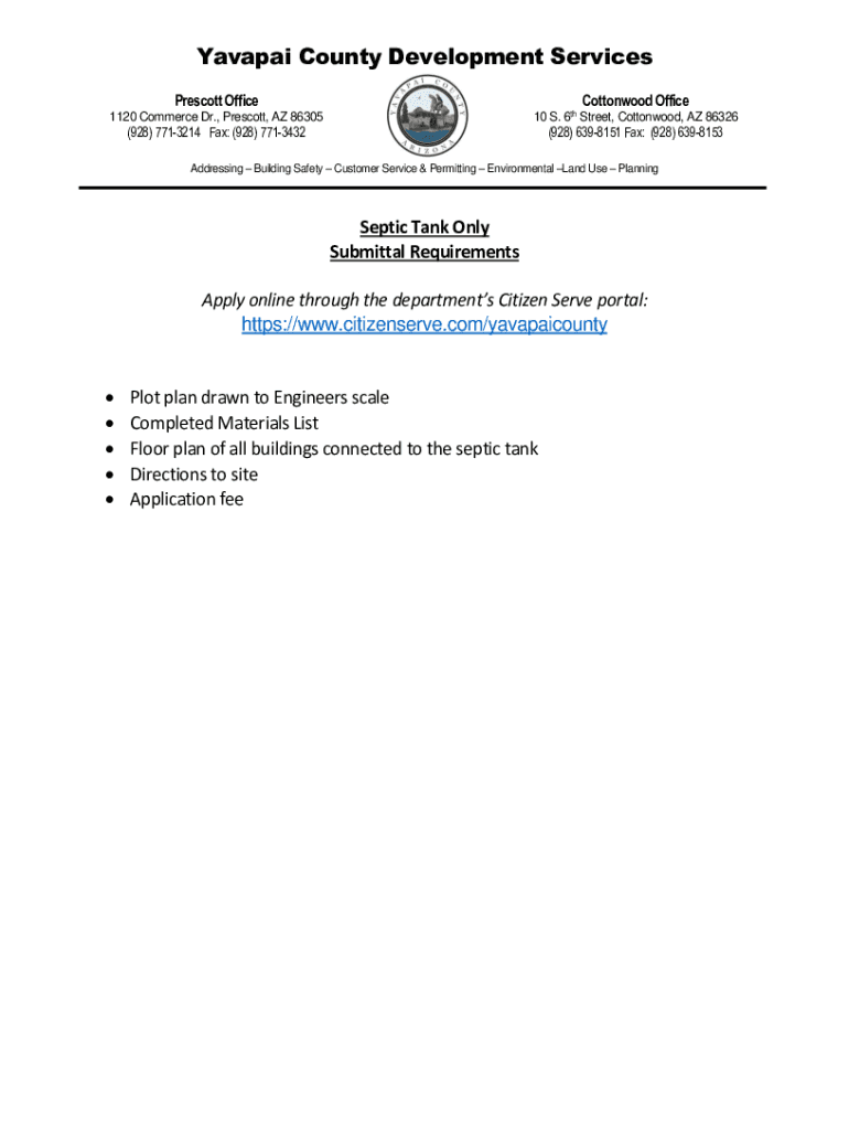 Yavapai County Development Services Prescott OfficeCottonwood Office1120 Commerce Dr., Prescott, AZ 8630510 S. 6th Street, Cottonwood, AZ 86326(928) 7713214 Fax: (928) 7713432(928) 6398151 Fax: (928)