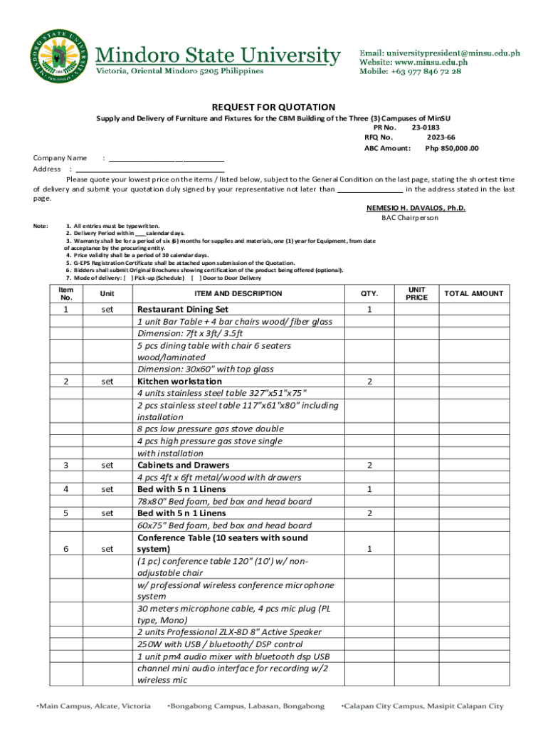 REQUEST FOR QUOTATION Supply and Delivery of Furniture and Fixtures for the CBM Building of the Three (3) Campuses of Minsk PR No. 230183 RFQ No. 202366 ABC Amount: PHP 850,000.00 Company Name : ___