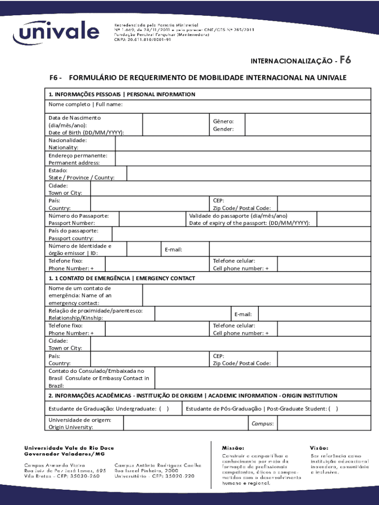 INTERNATIONALIZED F6F6 FORMULAIC DE REQUIREMENTS DE MOBILIZE INTERNATIONAL NA UNIVALVE 1. INFORM AES PERSONS | PERSONAL INFORMATION Nome complete | Full name: Data de Nascimento (did/ms/ANO): Date